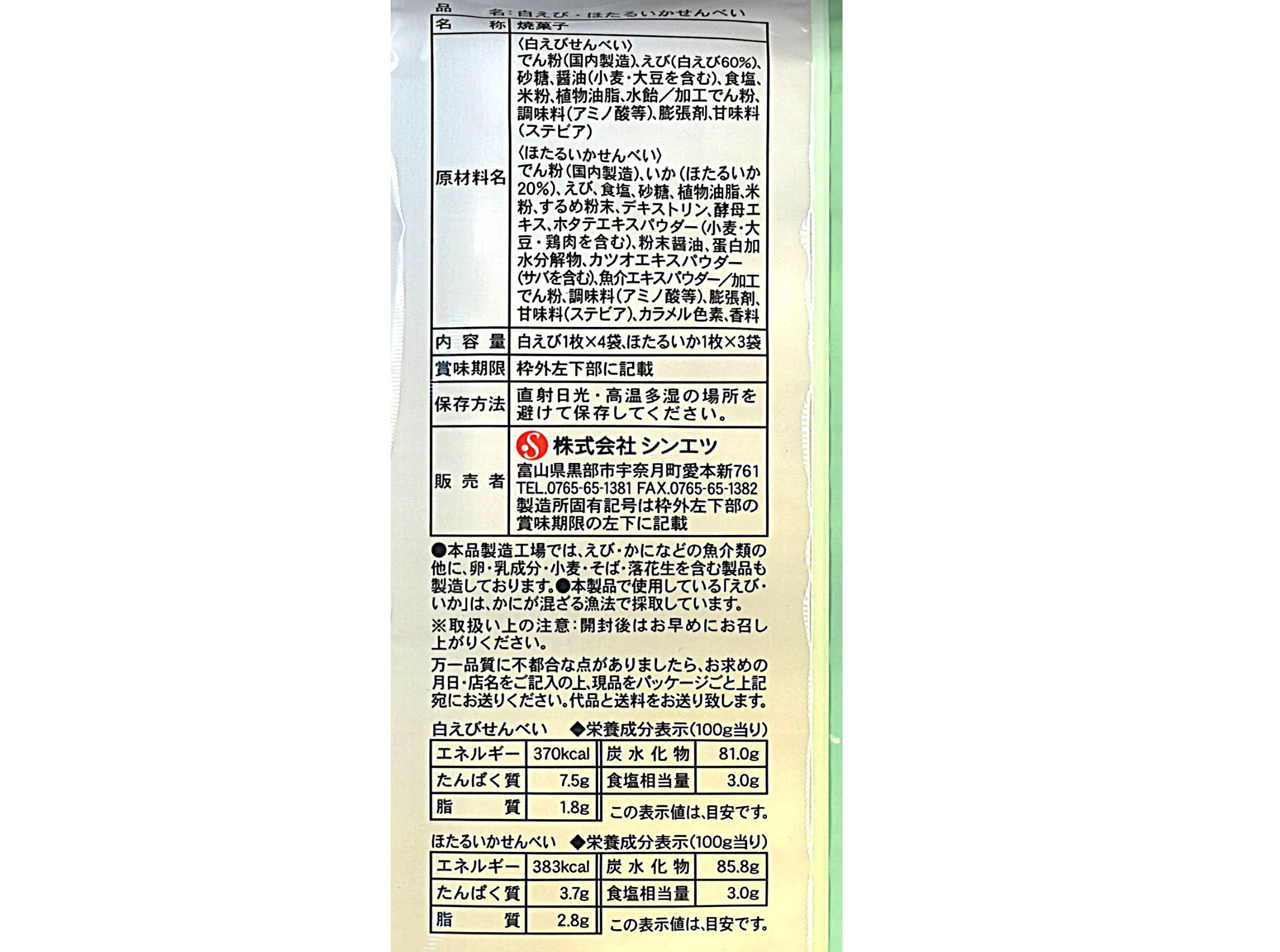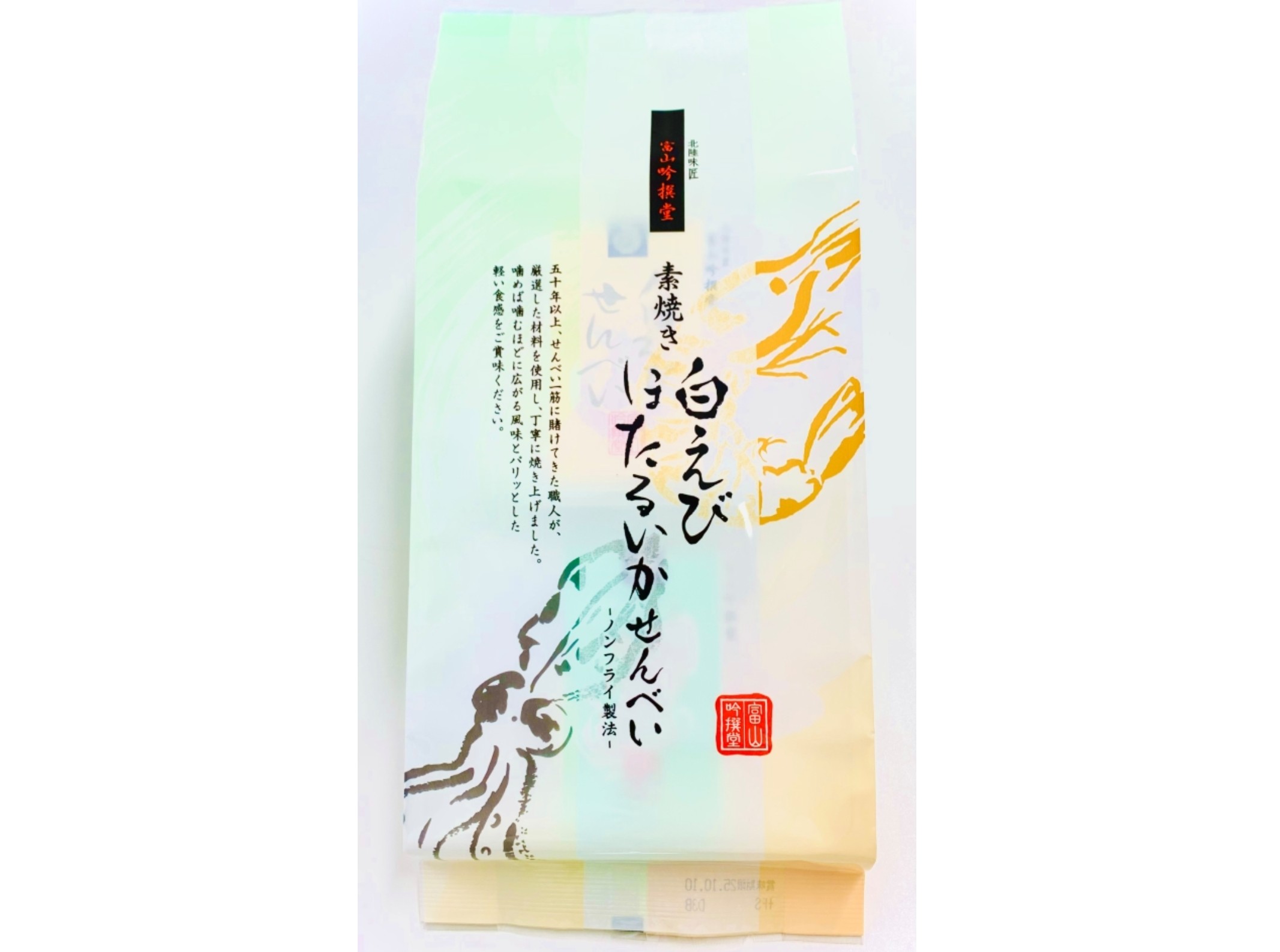 白えび・ほたるいか(7枚入) 2026年3月13日 ¥540(税込) 当社自慢の白えびせんべいに、富山ならではのほたるいかせんべいを詰合せにしました。 どちらの味も美味です。 お召し上がりくださいませ。 内容量: 白えびせんべい 1枚×4枚 ほたるいかせんべい 1枚×3枚
